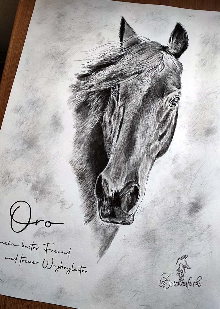 Aus diesem Grund empfiehlt sich die Kohlezeichnung vor allem bei Motiven mit überwiegend dunklen oder schwarzen Flächen, wie etwa Portraits von Rappen oder Tieren mit dunkler Fellzeichnung. Hier kann die Kohle ihre Stärken voll ausspielen und eine besondere Tiefe erzeugen, die dem Motiv eine ausdrucksstarke Präsenz verleiht.